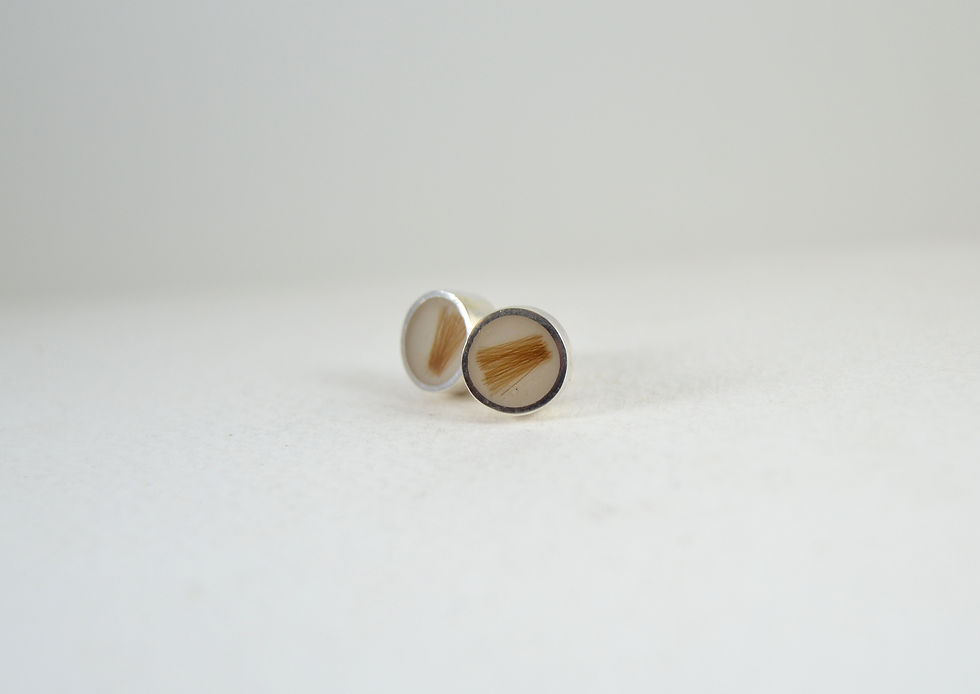 Boucles d'oreilles dormeuses, anneau et coupelles argent et bille de conservateur contenant les crins de votre cheval.